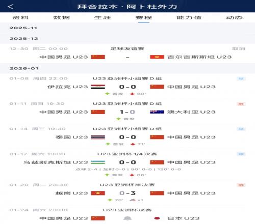 本屆賽事,拜合拉木前四戰(zhàn)全部首發(fā)出戰(zhàn),其中對陣澳大利亞U23打滿了全場。半決賽U23國足3-0越南U23的比賽中,拜合拉木替補登場,助攻王鈺棟打入了最后一球。